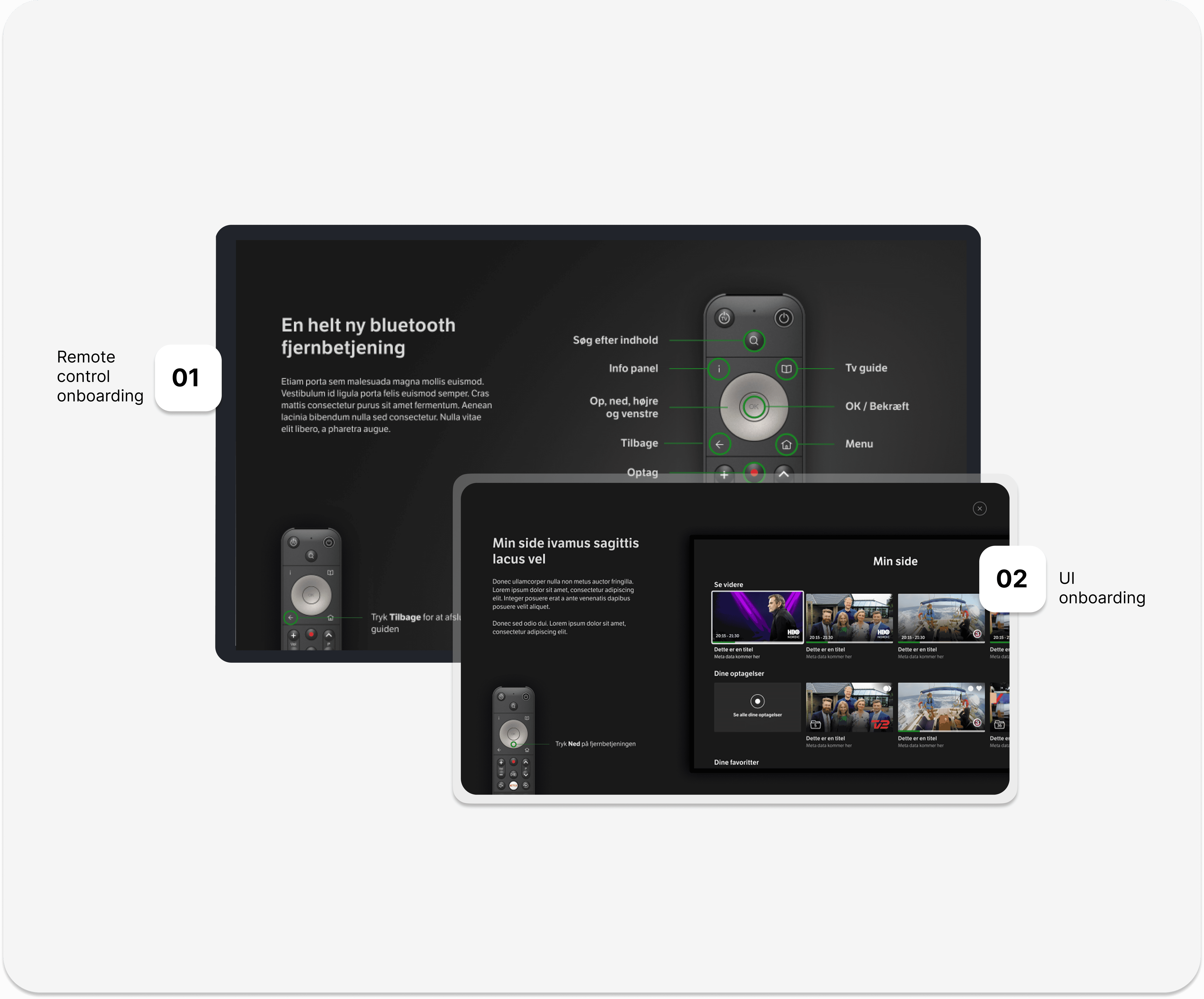 An interactive onboarding experience that triggers when customers first power on the TV box, guiding them through the new remote layout and highlighting frequently used buttons like fast forward and TV guide. This introduction also familiarised users with UI changes, including the updated record icon, improved TV guide text size, and clarified i-button functionality to display show information.